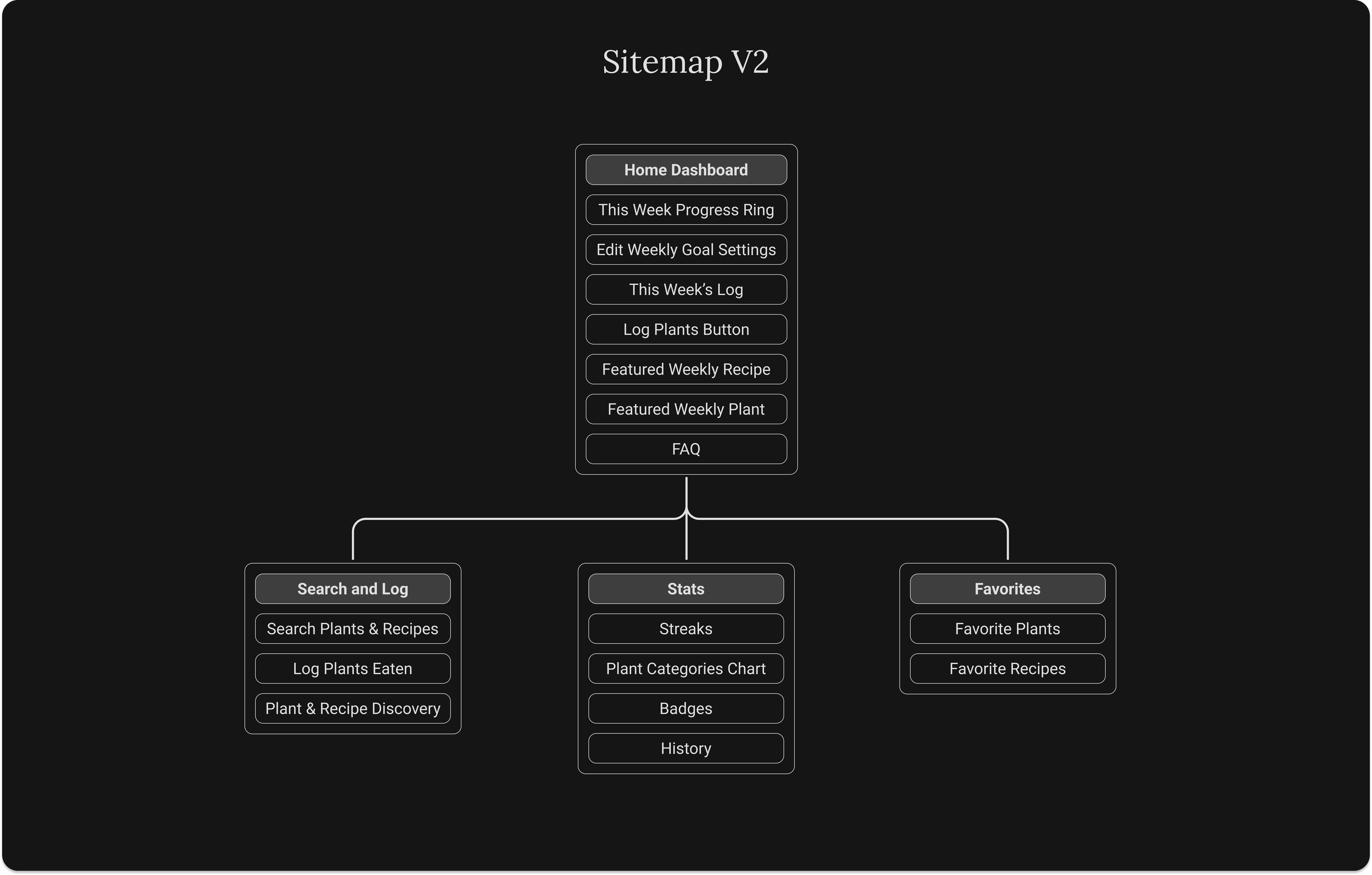 With my features defined, I began mapping out the app structure. There was a lot of iteration that took place in terms of architecture. I believed it was important to allow users the ability to log multiple plants at a time, so initially I planned to allow users to create and log their own multi-plant meals. This would change after some low-fi testing. V1 of the sitemap is shown below.