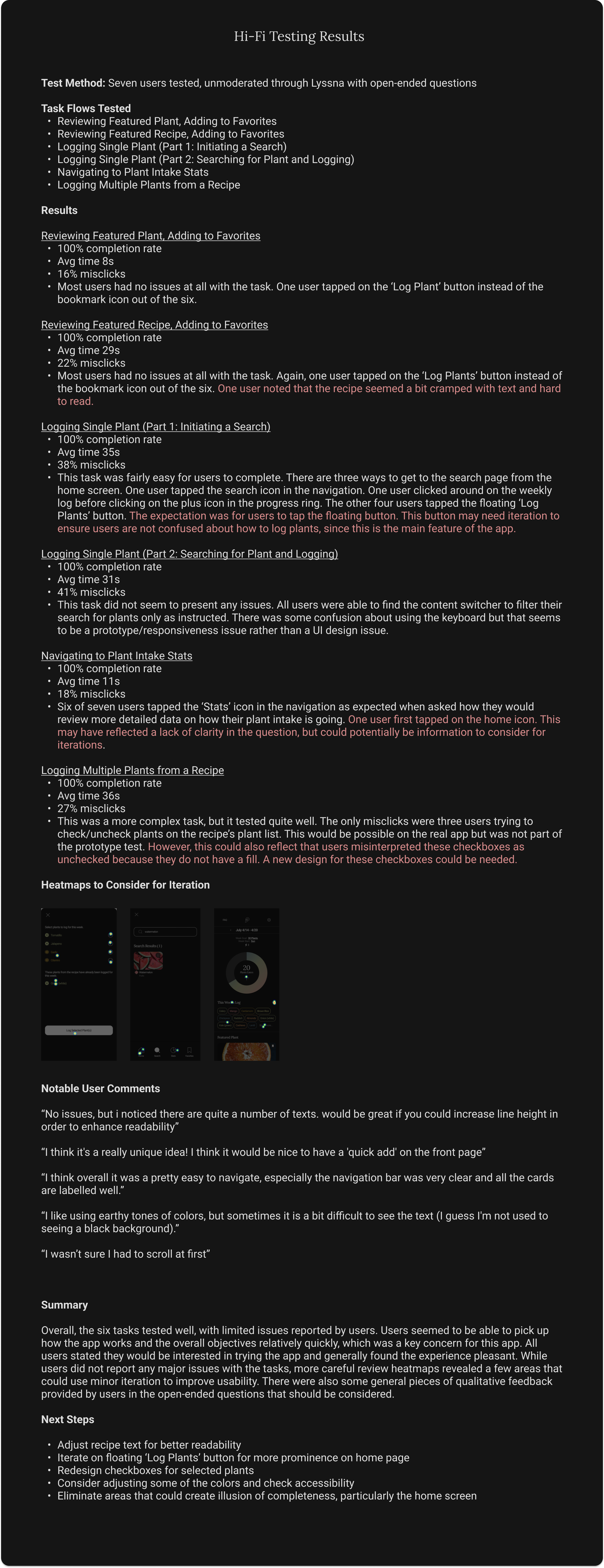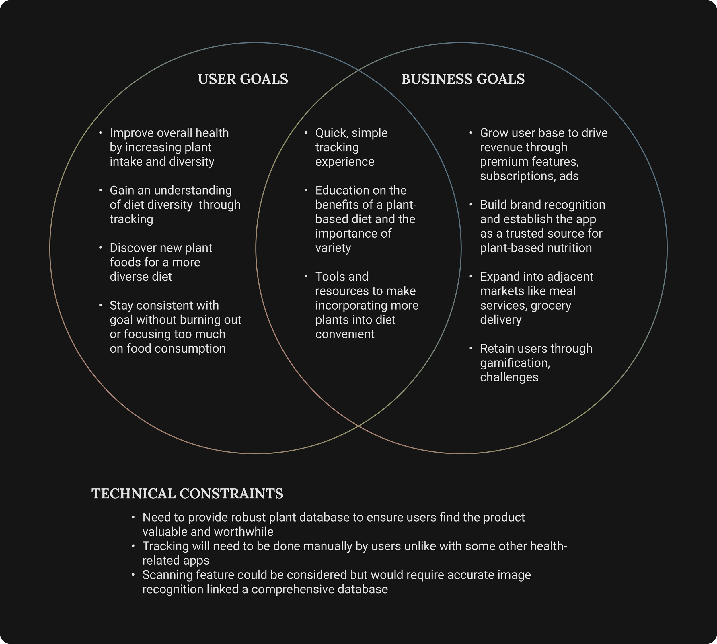 My strategy for these interviews was to start out broad by first asking users about diet and their feelings on plant foods, and gradually working toward more specific questions about user preferences in regard to wellness and tracking tools.