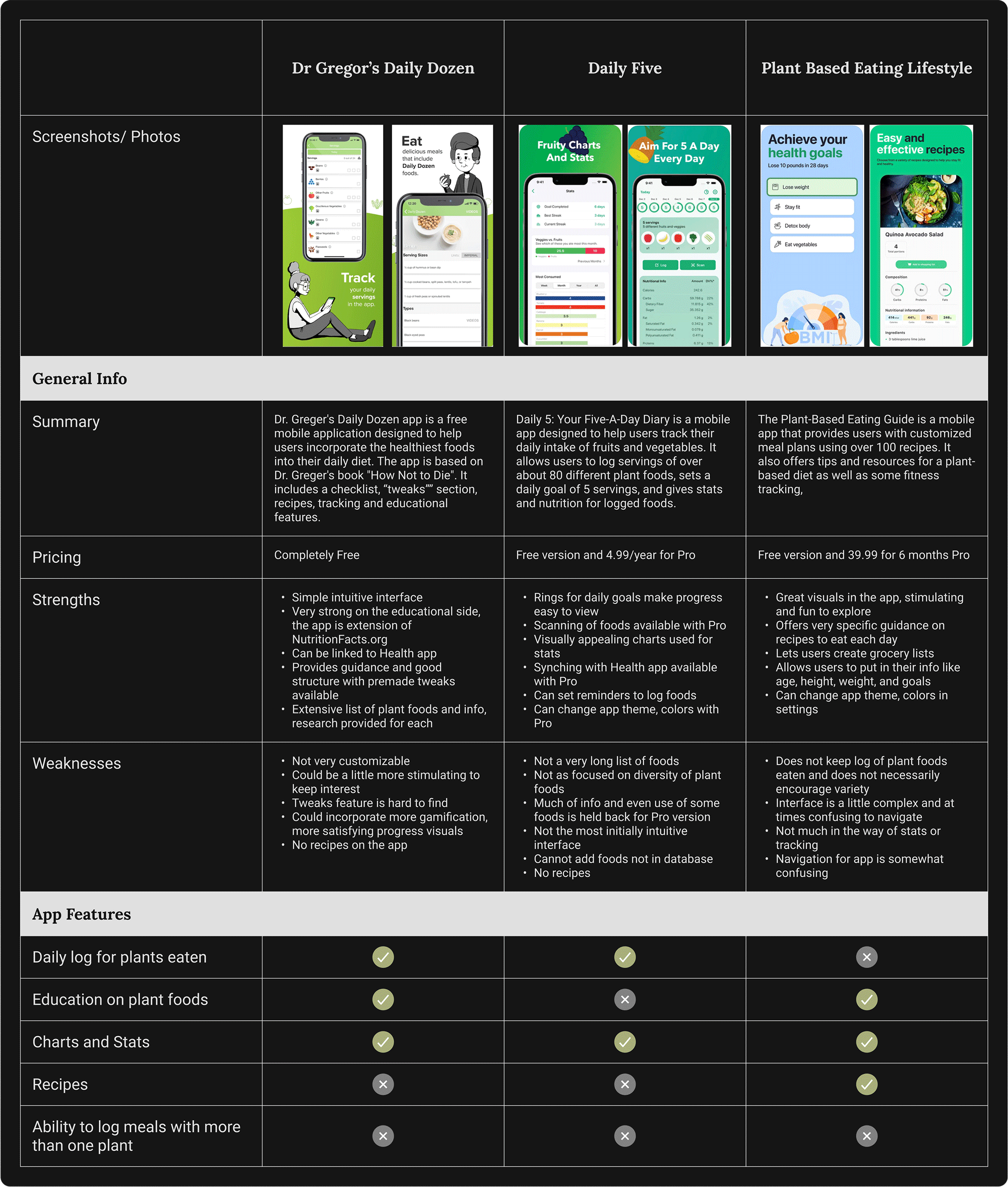 There were a few different apps available that set out to help users eat more plants. While these apps provide great resources for incorporating more plant foods, there are clear opportunities where a new app could fill in the gaps.