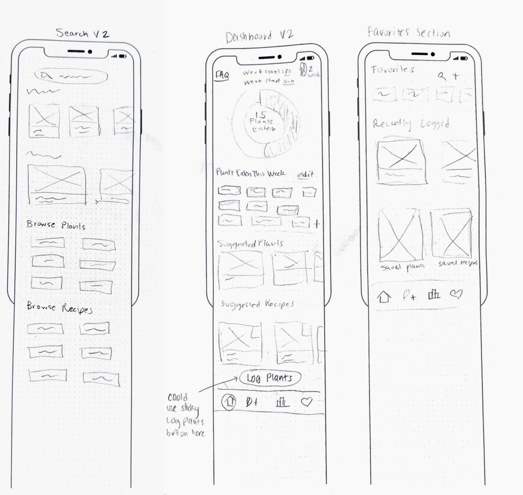 With flows mapped out, I began sketching out my ideas for the key screens. For the plant index and search functions, I drew up several different ideas.
