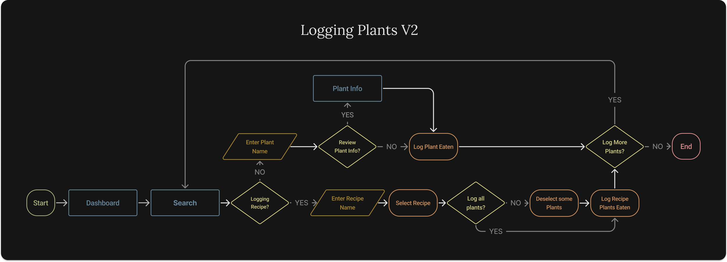 I mapped out the flow for logging plants. Below is the first version based on my initial plan which was more focused on allowing users to create and log their own meals.