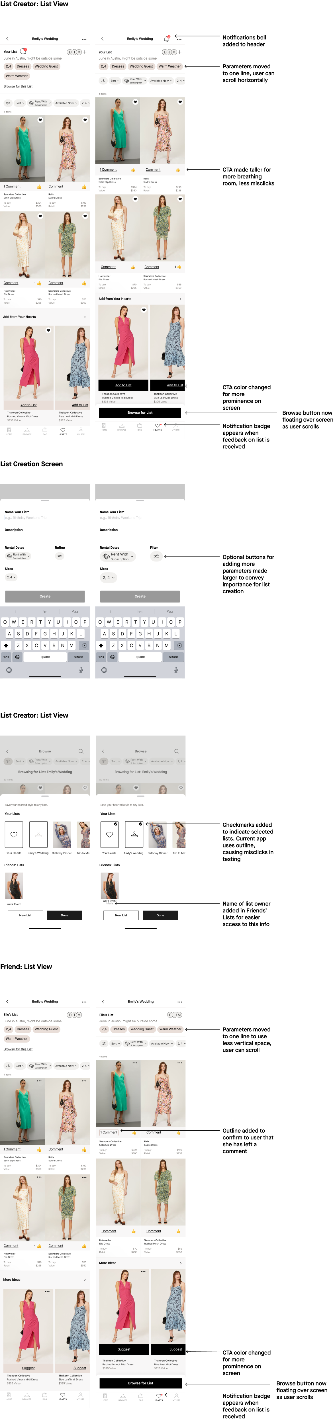 While roadmapping, I realized this feature could easily become too complex. Since Rent the Runway isn’t a social app, I focused on simplifying and streamlining how users get feedback from friends.