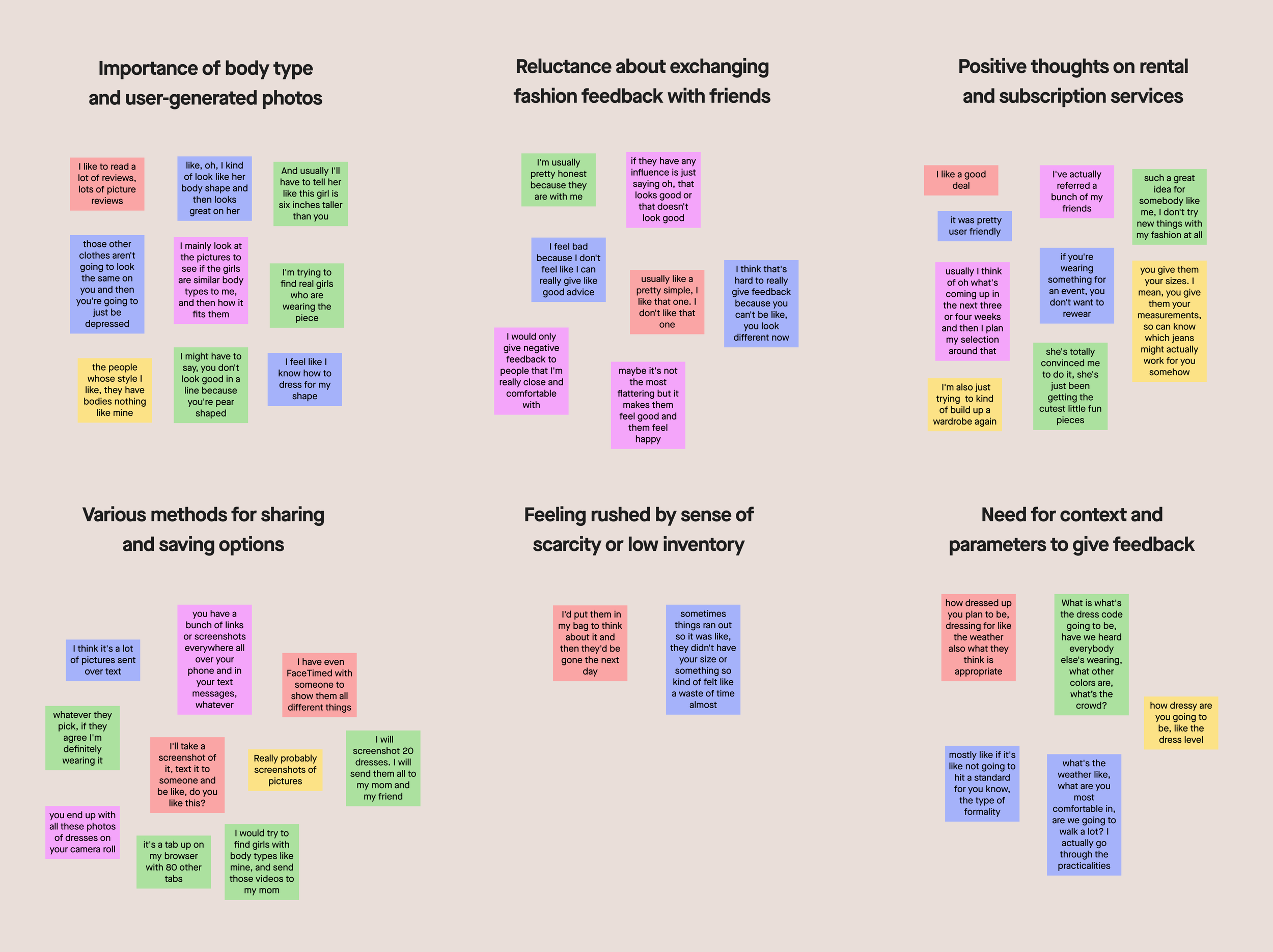 I prepared several interview questions and spoke one-on-one with five different potential users. Since Rent the Runway offers only womenswear, I chose to speak to five female participants. Interviews were done remotely through Google Meet video calls. Otter AI was utilized to record and transcribe all conversations for more effective synthesis.